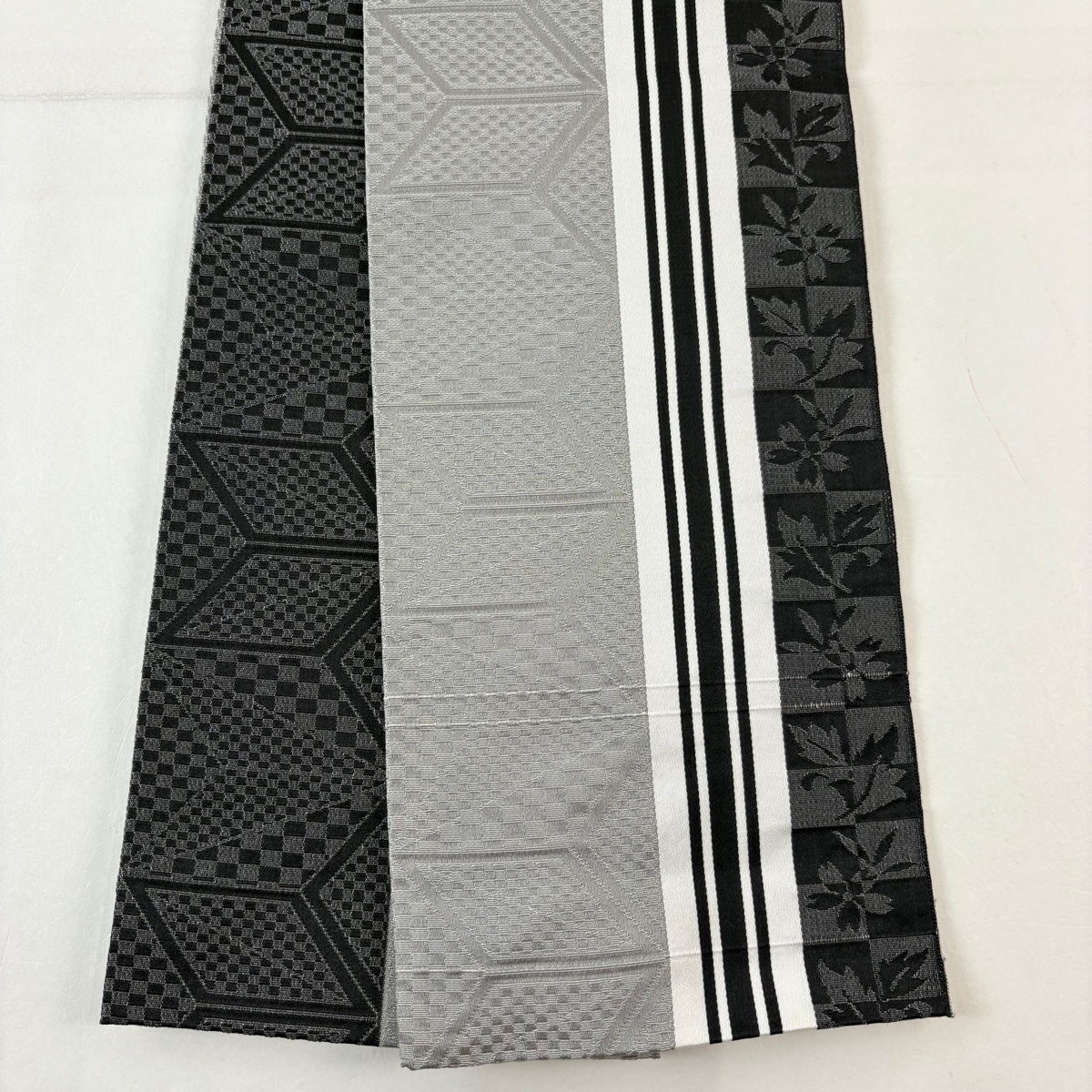 美品 半幅帯 優品 草花 縞 灰色 化繊 中古