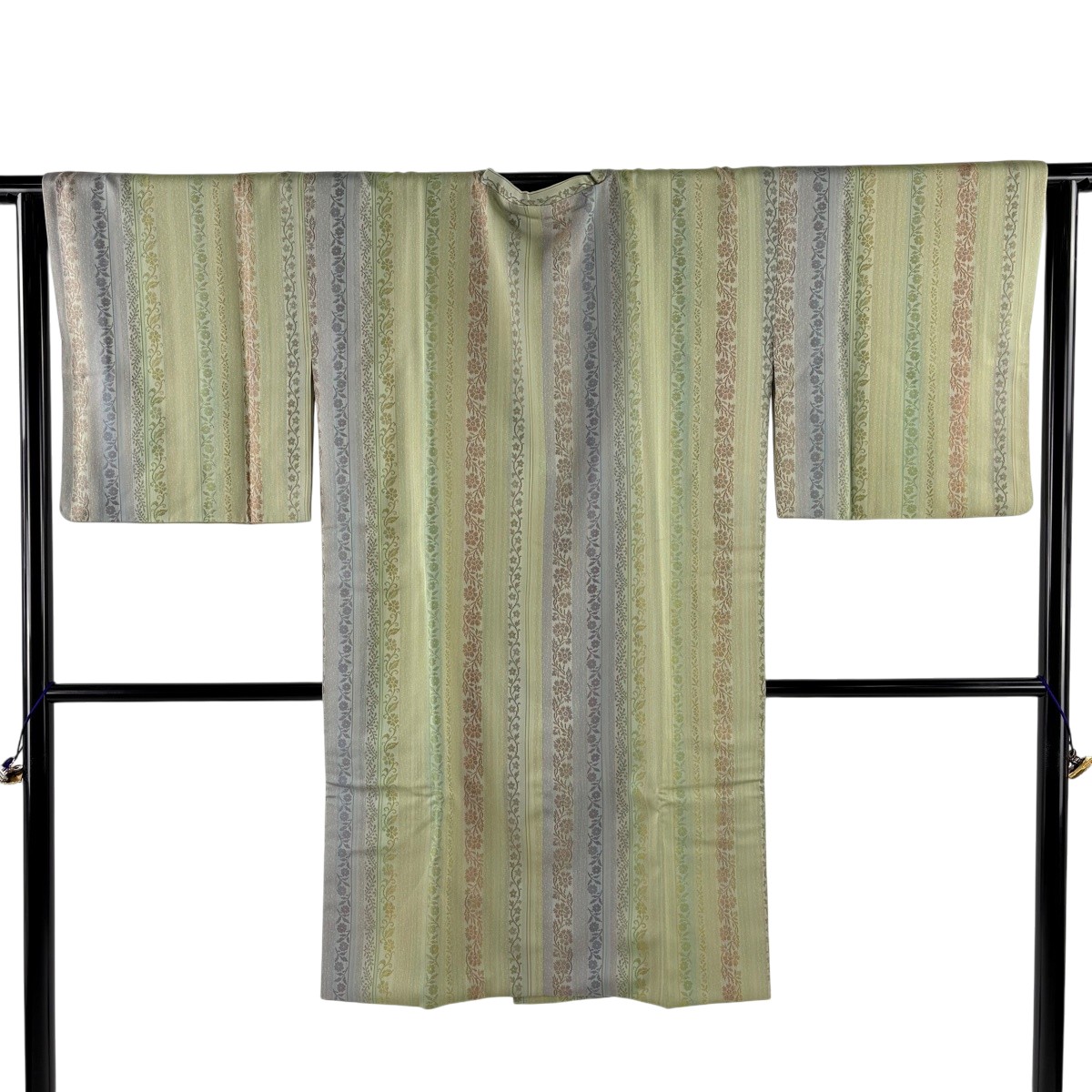 美品 道行 身丈106cm 裄丈65.5cm M 和装コート 角衿 落款あり 草花 縦縞 抹茶色 正絹 秀品 中古