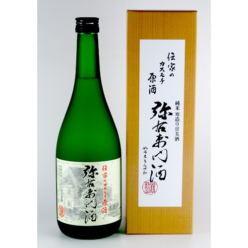 寛政二年創業の当家秘伝の甘美酒。米こうじの量を倍ぐらい加えて低温長期発酵させた独自な甘さとコクが特徴です。カスモチ原酒弥右衛門は厳選された会津米と霊峰飯豊山の雪解け水からなる伏流水を用い、身も凍る厳寒期に仕込まれます。ゆっくり気長にじわりじわりと発酵させ、晩春の頃初めて出荷されます。酒を仕込んだモロミをカスといい、モチは長く持たせるという意で、寒造り低温長期発酵がこの酒の特徴です。