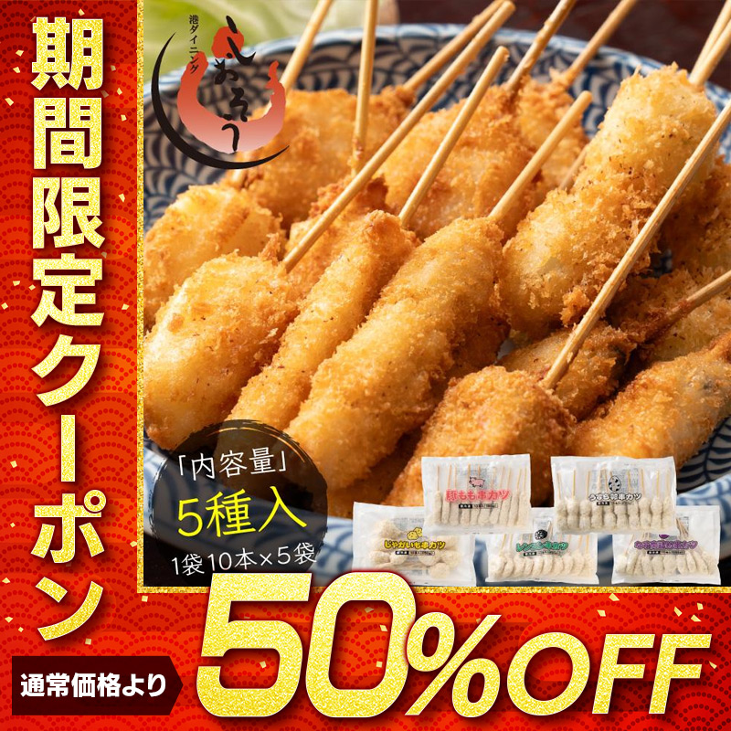 串カツ 5種セット 50本入り 串揚げ 豚 ジャガイモ ナス肉詰め レンコン うずら卵 ソース3袋付き 送料無料 手軽 簡単 おかず お酒のおつまみ 揚げ調理 惣菜