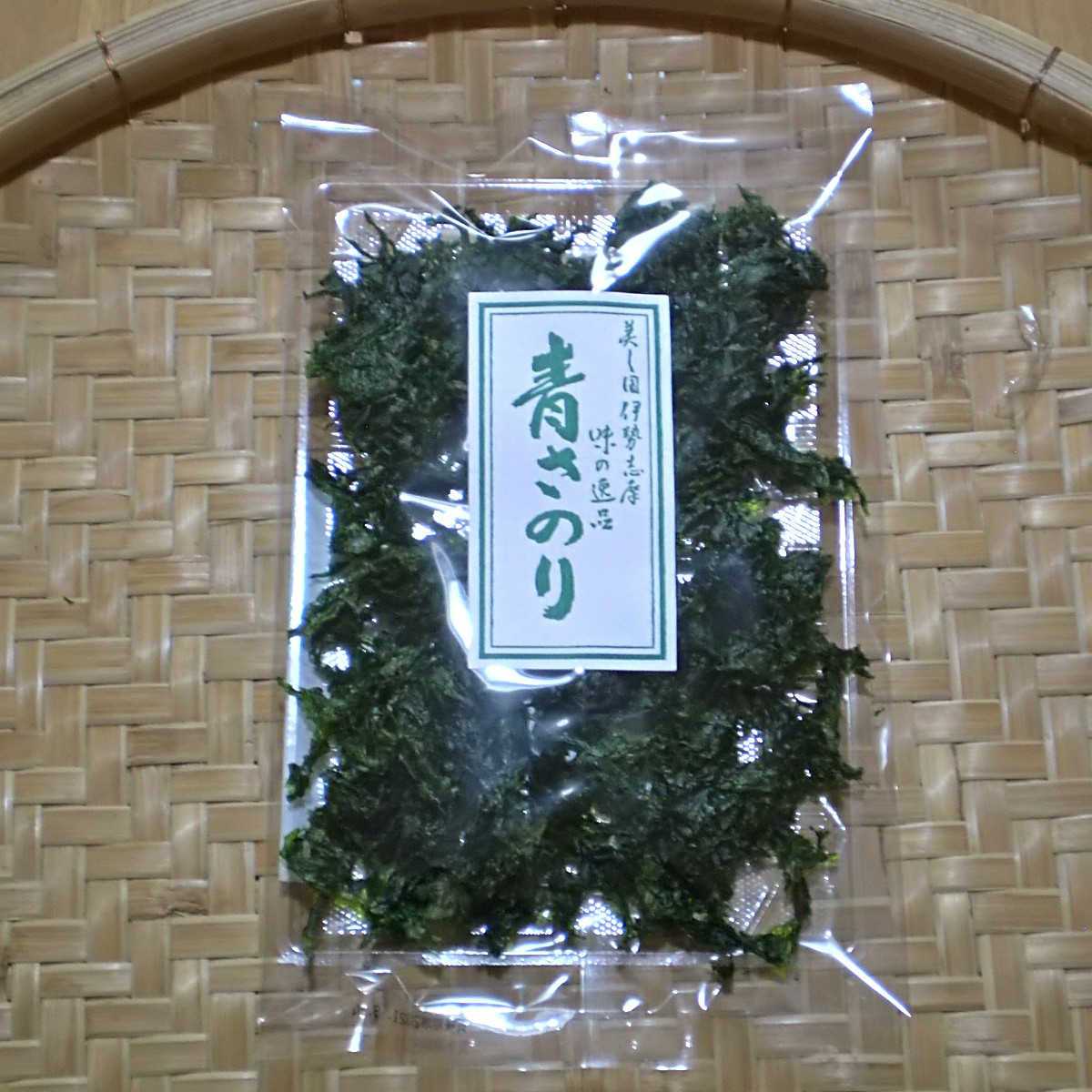 三重県の青さのり生産量は乾燥状態で年間約300トンあります。全国生産量の60%以上あり、日本一の産地です。青さのりの製造方法は大きく分けて「汐洗い」と「水洗い」の2通りあります。加工時に「汐洗い」は海水を使用し、「水洗い」は真水を使用します。当商品は水洗い製法に拘り、等級も上位グレード(優等〜特等)を仕入れるよう努め、品質にも拘っております。水洗い製造の青さのりは塩分が少ないので、使用時に水洗いや水戻し等で塩分を抜く必要がなく、お味噌汁やうどんにそのまま入れてお使い頂けます。