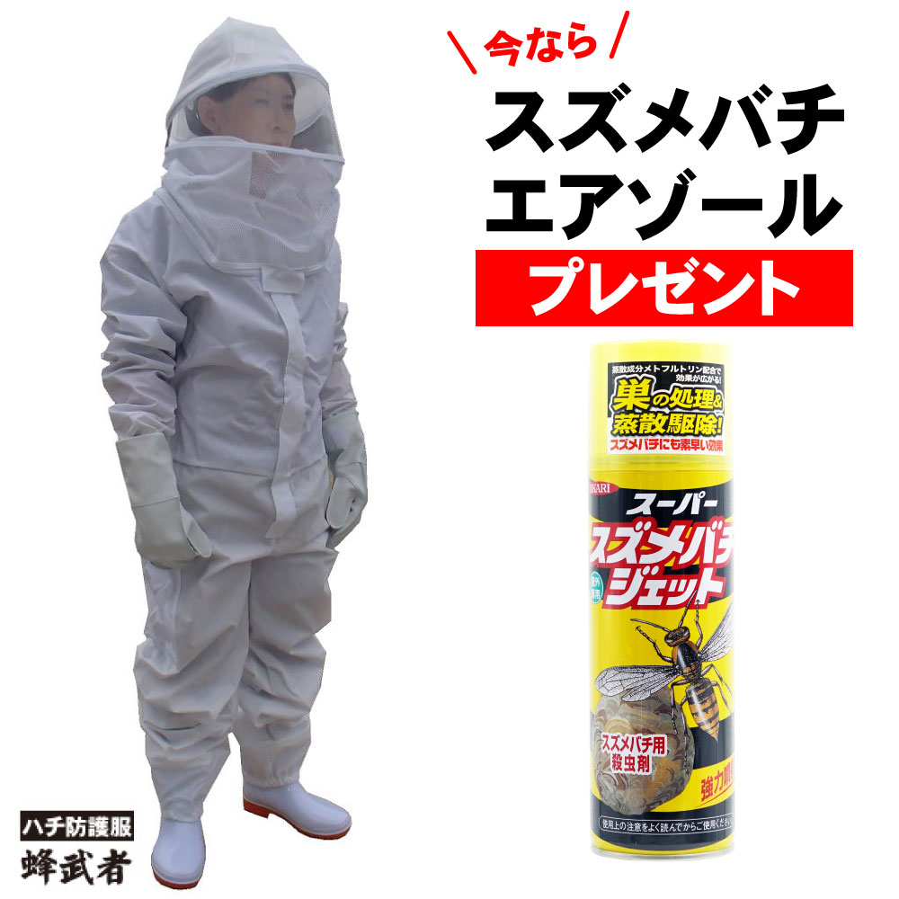■今までに無い1ピースタイプ防護服(上下一体式) ・耐久性の高いナイロン生地にPVCコーティングを施しました。 これにより蜂が防護服にとまれず、針に対する突き刺し強度もUPしました! ・従来の表面がビニール素材の商品とは違い強度の高いナイロン生地なので、 作業時にひっかけて破れるなどの破損が激減します。 ・上下一体式防護服なので着脱が簡単!作業服を切る際の手間が省けます。 ・身長の高い方(190cm)でも使える余裕のサイズ設定。 ・上下の防護服の接続部分が無いので接続部分や折り返し部分への蜂の侵入がありaません。 ・首襟があるので蜂の攻撃から首周りも守ります。 ・今までに無かったポケットを左右に設置!殺虫剤や工具などが入ります。 ハチダウンがすっぽり入る大型ポケットです。 ・防護服裏側はメッシュになっているので汗などのベタ付き、張り付きを防止します。 ■熱気のこもらない通気性の高い防護ヘルメット ・面部はヘルメット全体を通気性の高いメッシュで覆いますので ヘルメットと面部分の接続部分からの蜂の侵入の心配がありません。 ・頭部の側面に大きな通気口をもうけ頭部の熱気を逃がします。 ・面部分の視界を広くとり、通気性の高い首メッシュで熱気を逃がします。 ・面部分には視界性の高いプラスチックを使用し、蜂の毒などから作業者を守ります。 ・とても軽量なので作業者への負担が軽減します。 | |