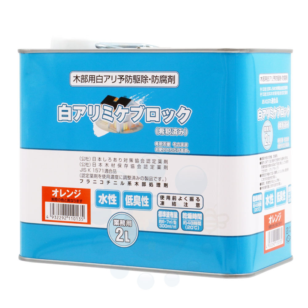 ◆希釈不要、そのままお使い頂けます。 ◆蒸気圧が極めて低く、揮発しにくいため、居住者に対する安全性が高い。 ◆臭気、刺激性がほとんどありません。 ◆木材腐朽菌、カビに対する効力が高い。 ◆イエシロアリ、ヤマトシロアリ、アメリカカンザイシロアリ等、白蟻全般に有効です。 |