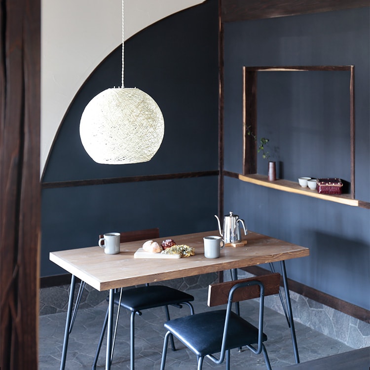 紙紐を球体にかたどった和テイストのペンダントライト。シェードの隙間からは電球の光が漏れ、壁や天井に影を作ります。影もまた情緒ある雰囲気を演出してくれますよ。