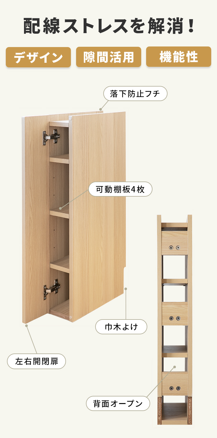 置き場に困るルーターやコードをまとめて隠し、狭い隙間を有効活用。扉付きで見せない収納とすっきり隠し、掃除のしやすさや安全性も向上します。