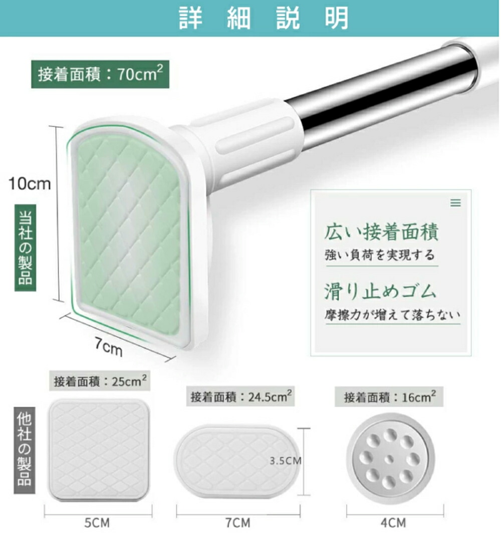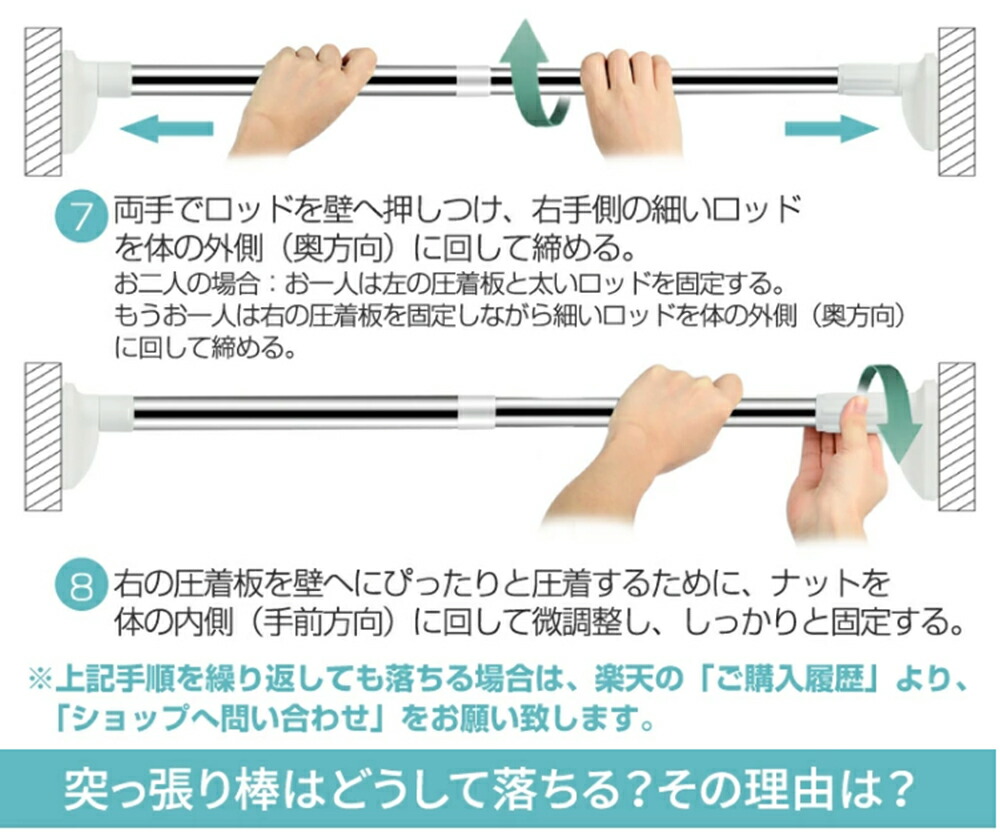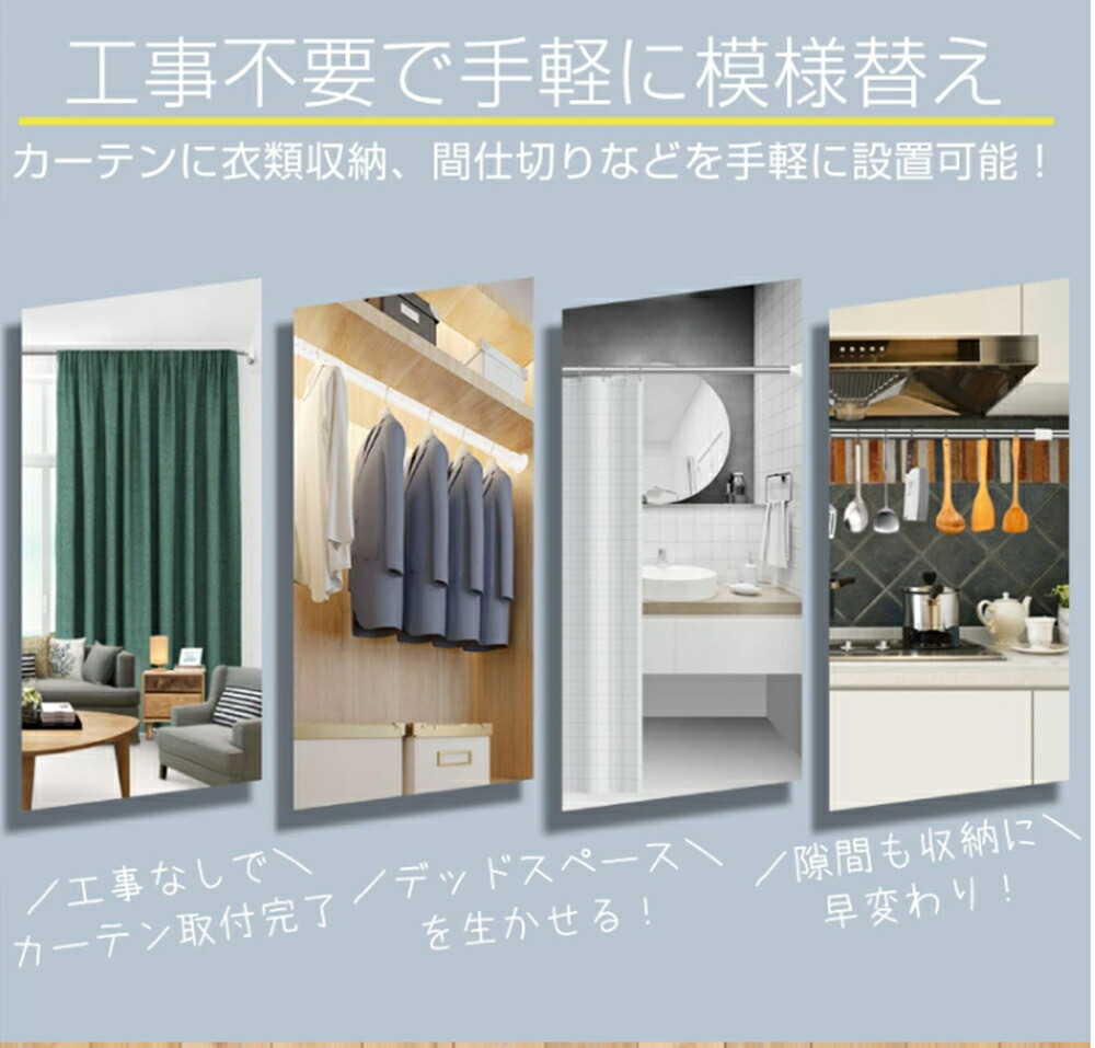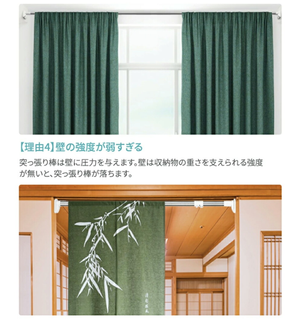 ・ばねを使用しないため、壁に突っ張ったときにばねによる伸縮がございません。その為より強力に突っ張ることが可能ですが、「柱」や「しっかりした下地」がない場所に取り付けた場合、壁が突っ張る力に耐えられず壁を破損したり、上手く突っ張れない等の原因となります。