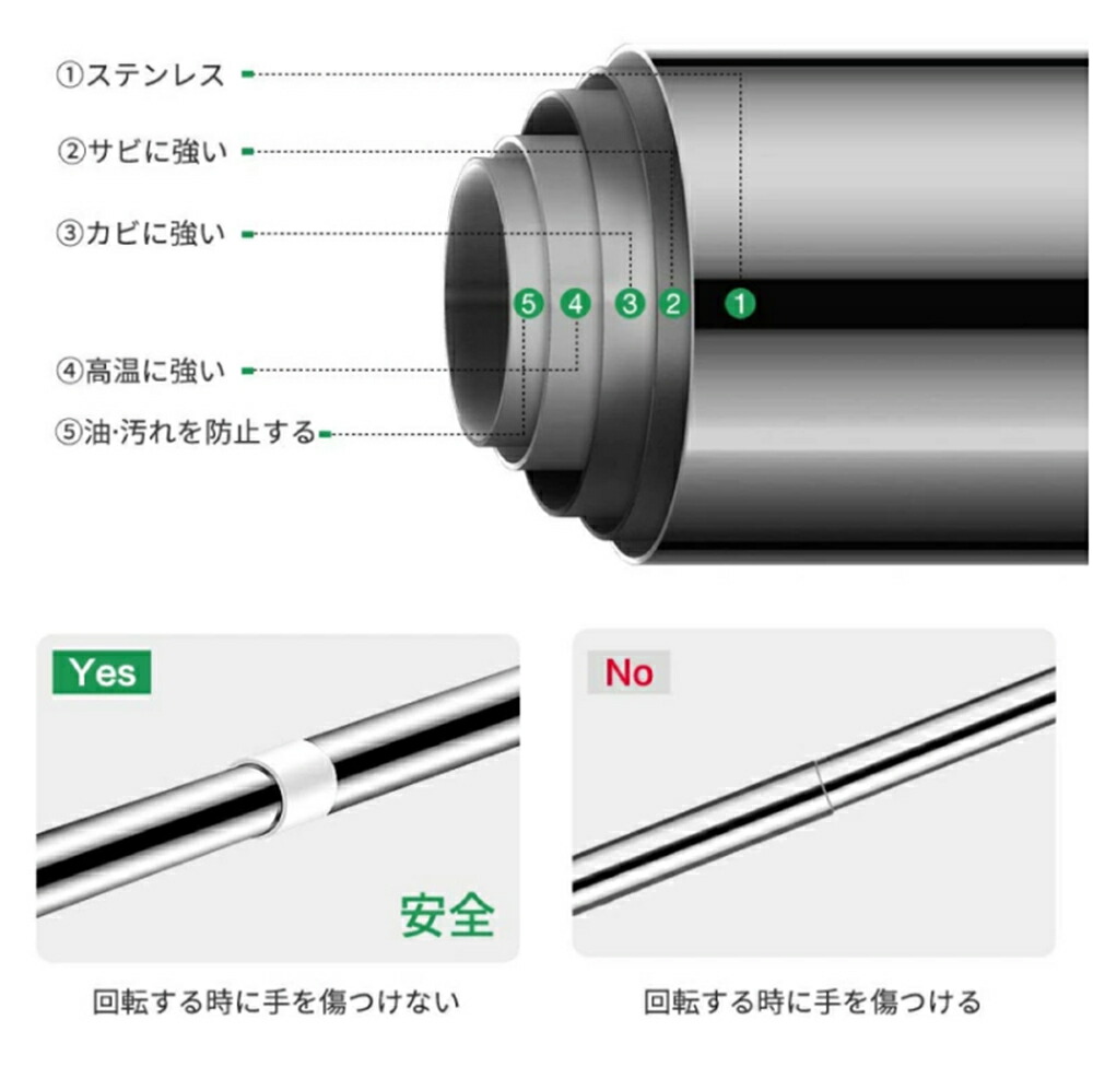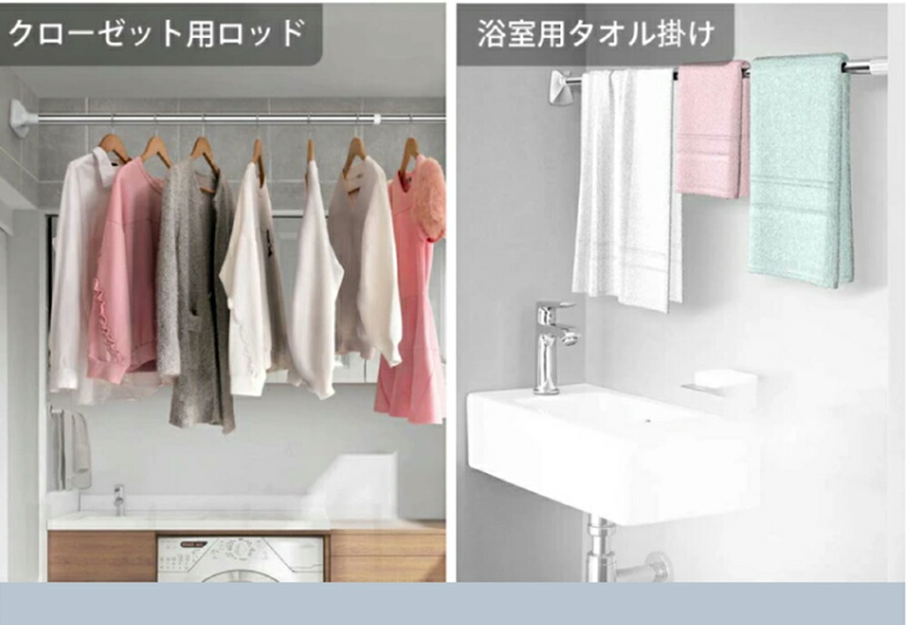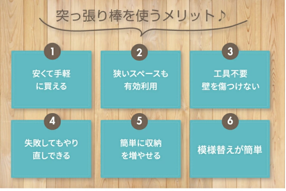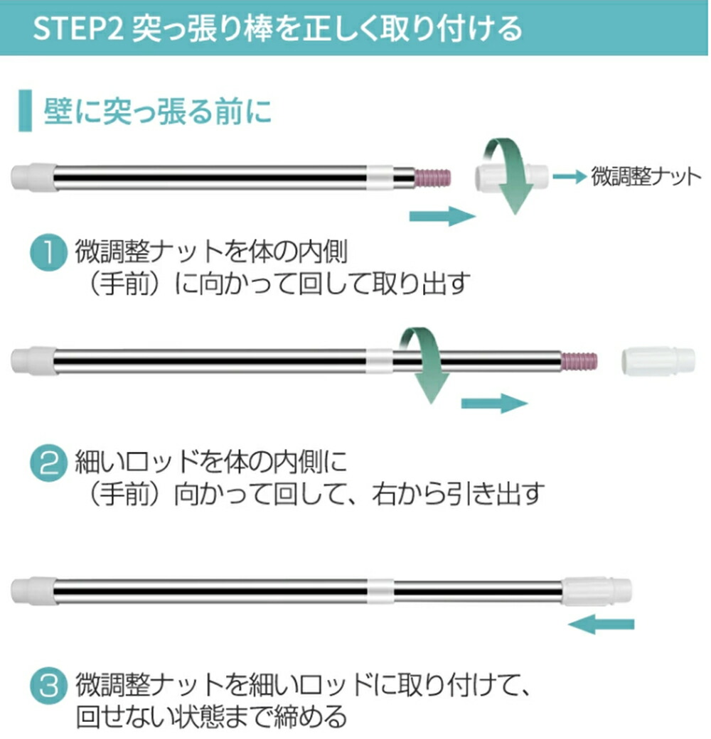 ・ばねを使用しないため、壁に突っ張ったときにばねによる伸縮がございません。その為より強力に突っ張ることが可能ですが、「柱」や「しっかりした下地」がない場所に取り付けた場合、壁が突っ張る力に耐えられず壁を破損したり、上手く突っ張れない等の原因となります。