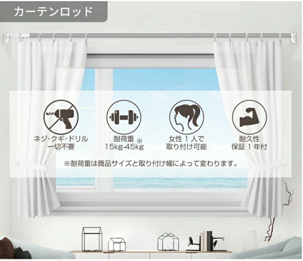 ・取付範囲ギリギリの寸法でご購入されますと、突っ張りずらい場合がございます。取付範囲の最小最大サイズより5cm〜20cm程度余裕をもってご購入されることをお勧めいたします。当店推奨対応幅はサイズ一覧表よりご確認ください。
