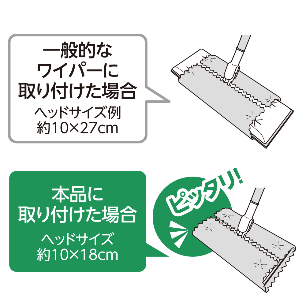 一般的なフローリングワイパーのヘッドに使い捨てマイクロファイバークロスを取り付けた場合、ヘッドの方が大きいため、ヘッドがはみ出てしまいますが、本商品はヘッド幅を約18cmに設定することで、使い捨てマイクロファイバークロスに最適なサイズになっています。