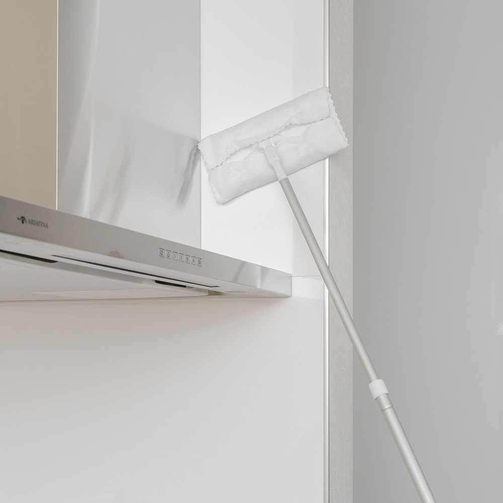 ミニワイパーに取り付けることで、手が届きにくい、棚の間のような狭い場所、また壁面のような高い場所・レンジフード周り等のお掃除にもお使いいただくことができます。