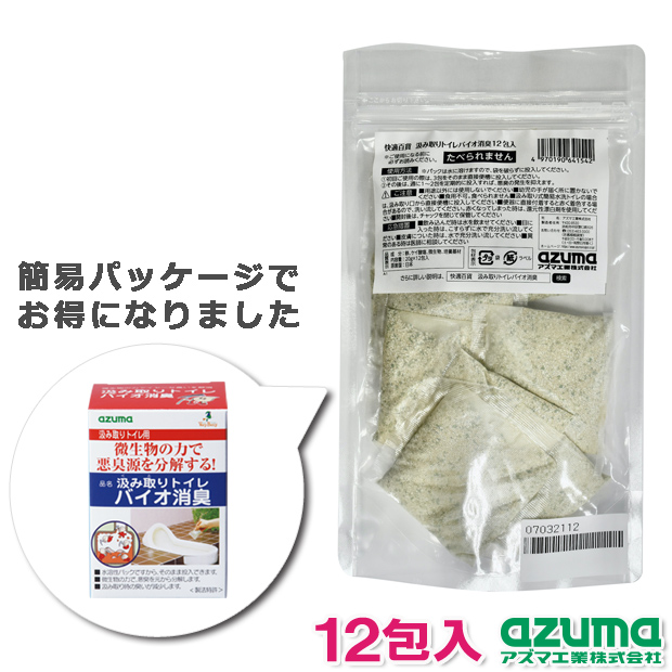 人気の「汲み取りトイレバイオ消臭」の簡易パッケージ商品です。開封後の保管に便利なチャック付きの透明袋を使用しています。