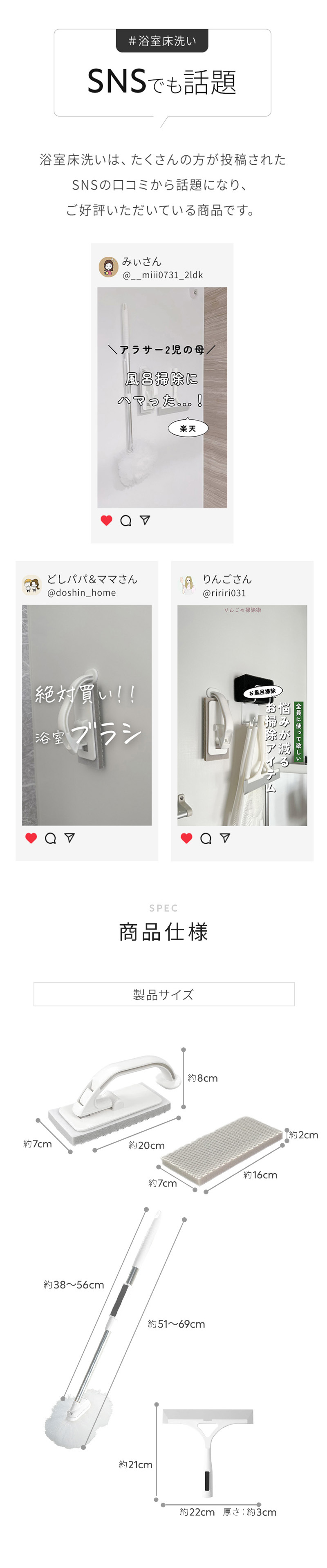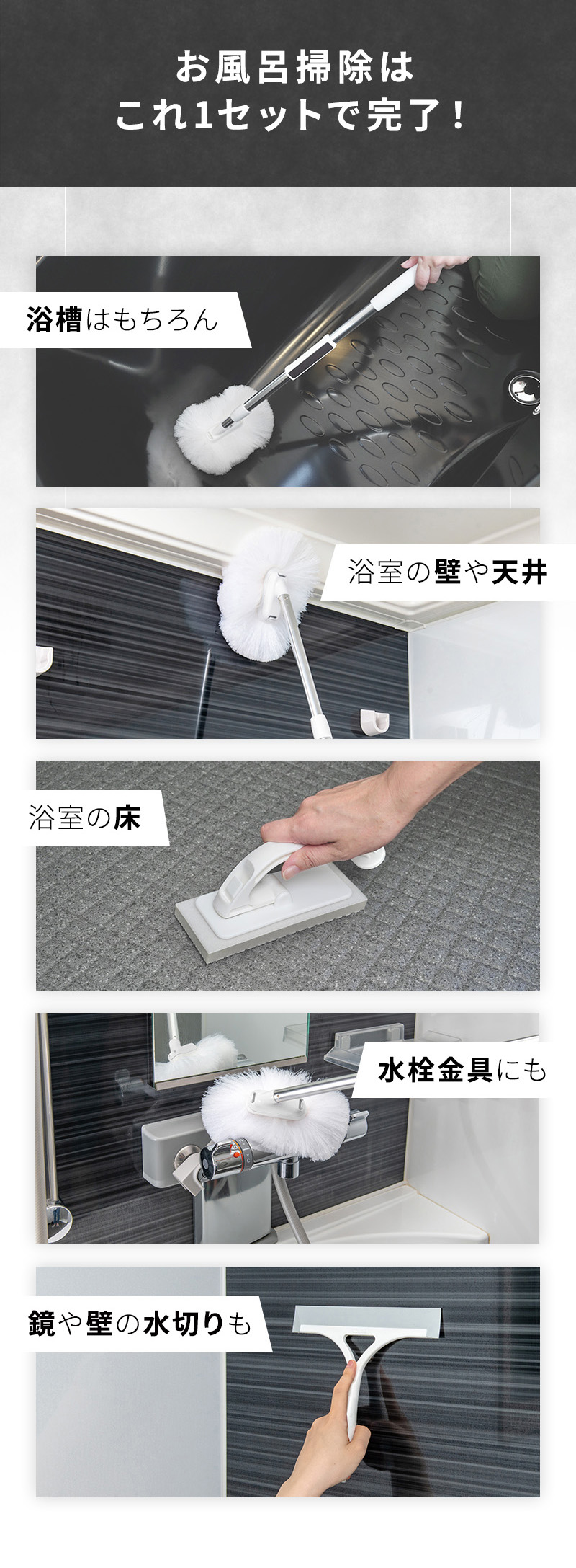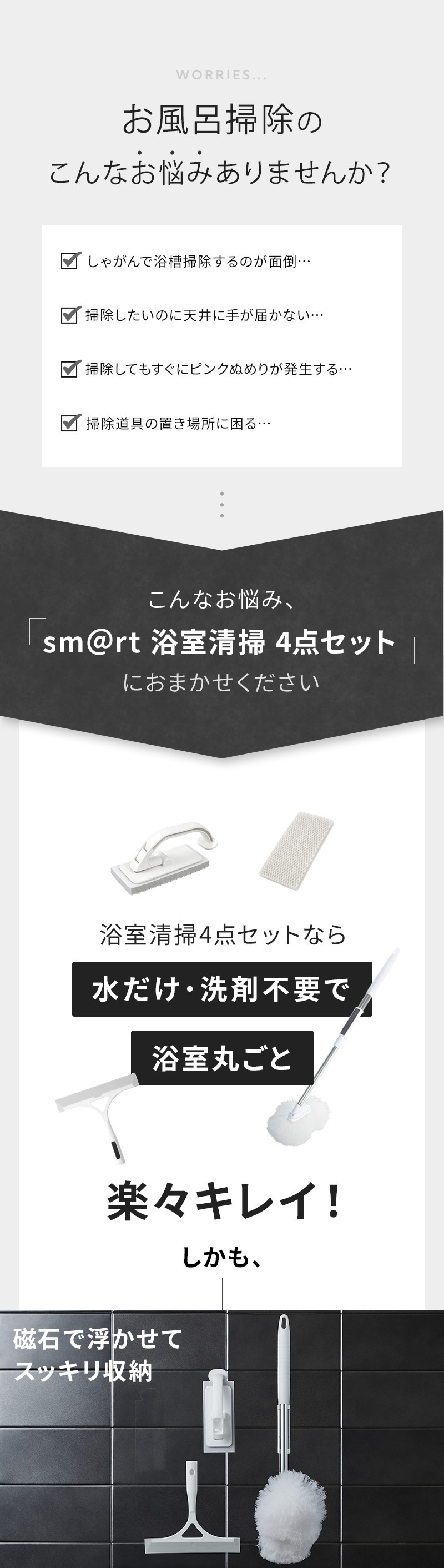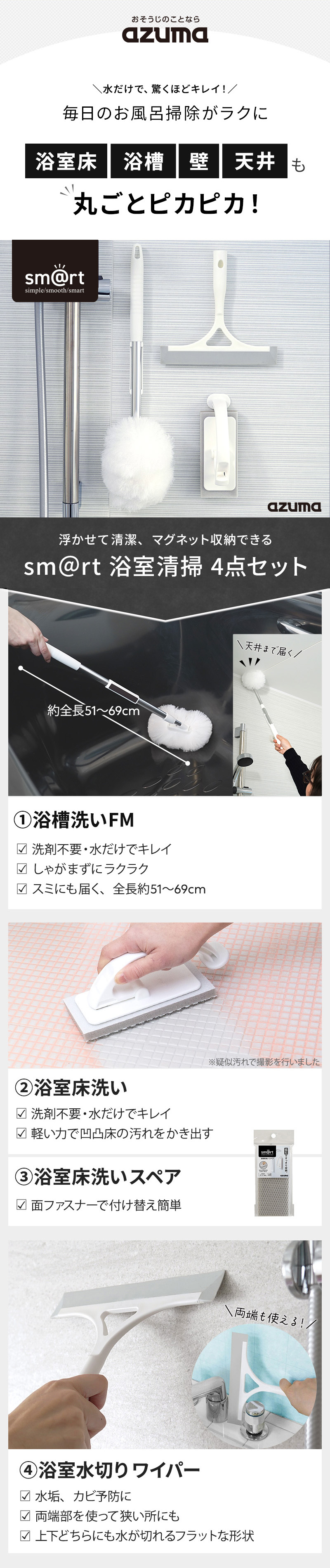 アズマ公式 sm@rt 浴室清掃 4点セット マグネット 収納(浴室床洗い、浴室床洗いスペア、浴槽洗いFM、水切り ワイパー)磁石 モップ ブラシ お風呂 風呂