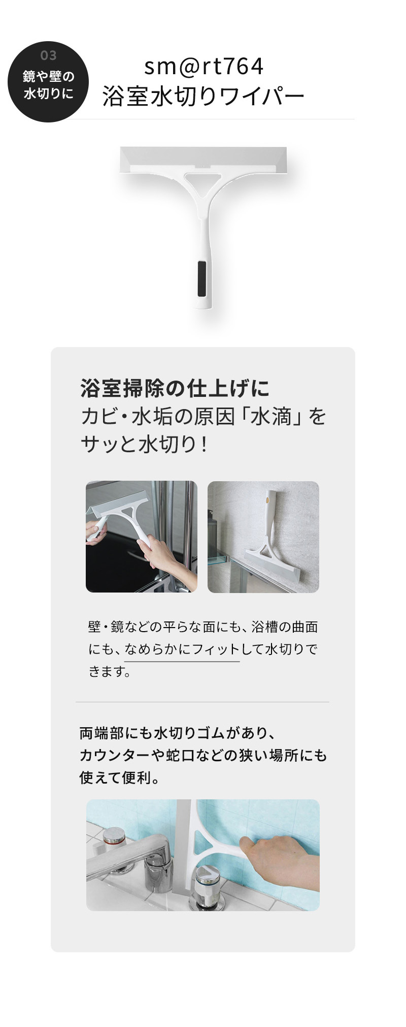 ●sm@rt764浴室水切りワイパー:サッと水を切って水アカ、カビを防止。