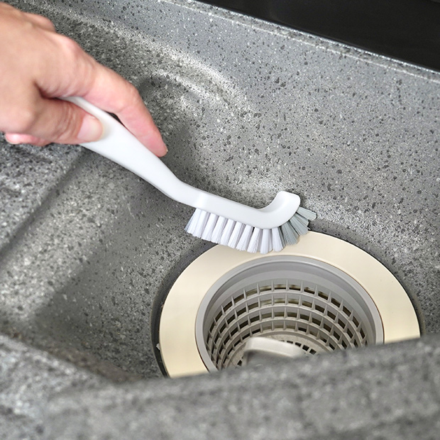先端の硬めブラシで角に溜まった汚れやこびりついた汚れをかき出し、やわらかめのブラシで汚れをこすり落とします。