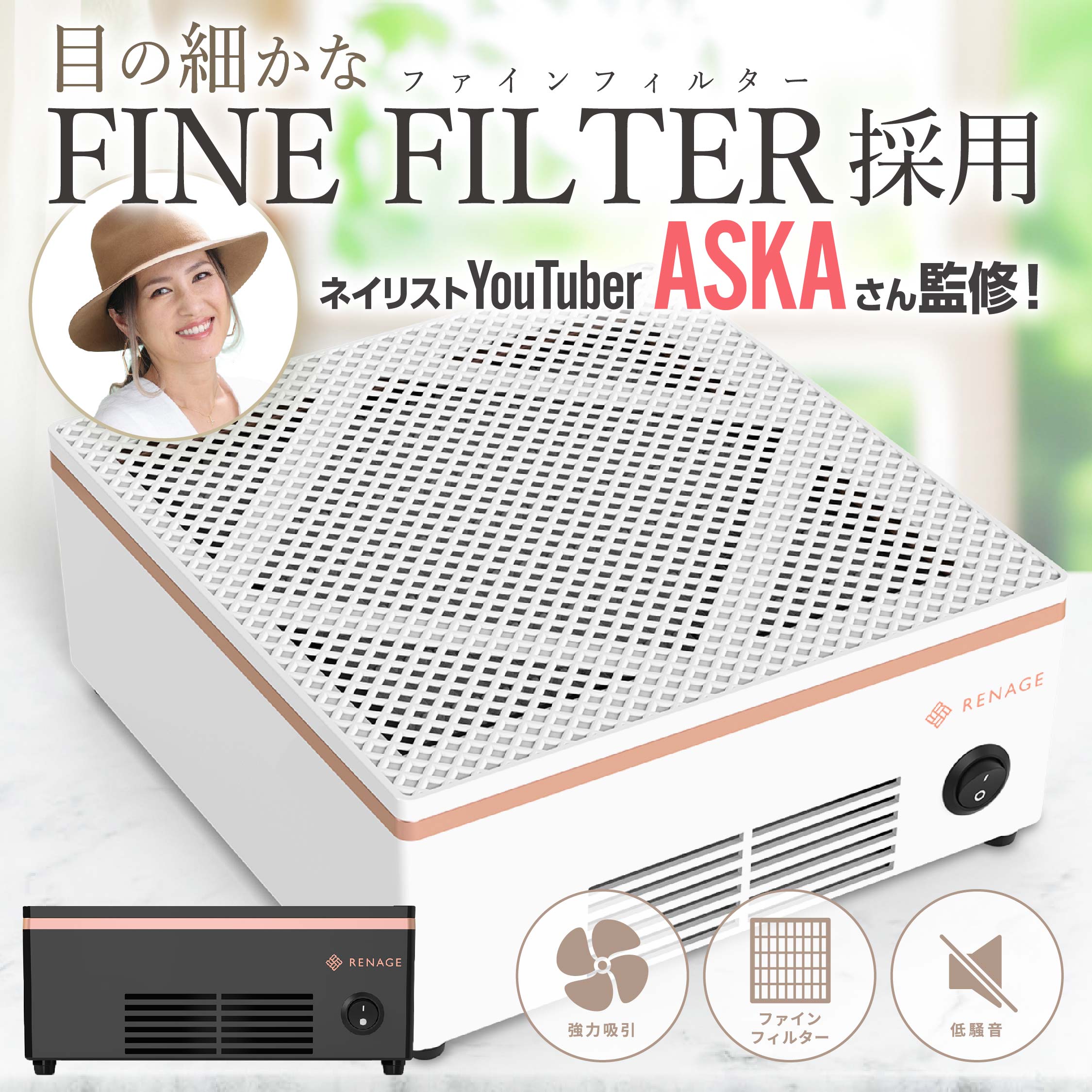 ASKA」さんが監修。操作は電源のワンボタンのみ、風量の微妙な調整などは不要で簡単にすぐ使えるシンプル設計。また、ASKAさんによるネイルオフの分かりやすい解説動画も付属。初心者も安心してネイルオフを始められ、サロン並みの使い心地をご体感いただけます。