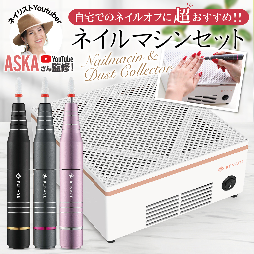 【登録者数!99,300人突破!!人気YouTuberが監修!!】皆様に選ばれて楽天「バッファー、爪やすり部門ランキング1位」を受賞させていただきましたRENAGE ネイルマシンと、ネイル関連動画を投稿している人気YouTuber「ASKA」さん監修のRENAGE ネイルダストコレクターをセットにした、お得なアイテムが登場!!1本でネイルオフから甘皮処理まで簡単にケア出来ちゃうRENAGEネイルマシン!操作は電源のワンボタンのみ、風量の微妙な調整などは不要で簡単にすぐ使えるネイルダストコレクター!ASKAさんによる分かりやすい解説動画も付属。初心者も安心してジェルネイルを始められるお得なセット販売となっております。