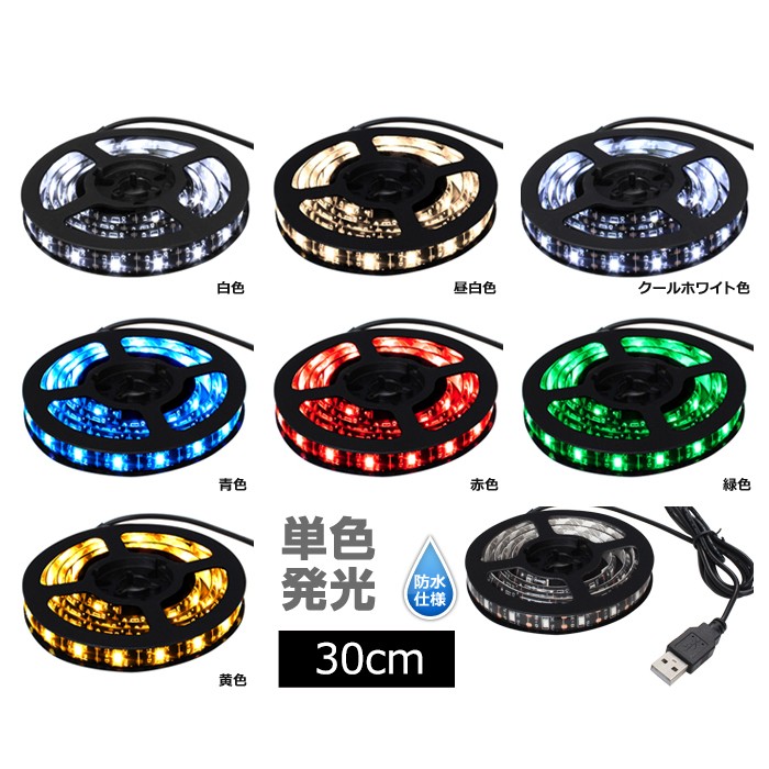 USB LEDテープライト 防水 5V 30cm 1チップ 黒ベース ×1個