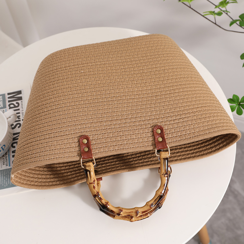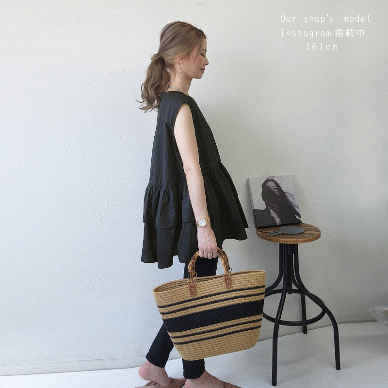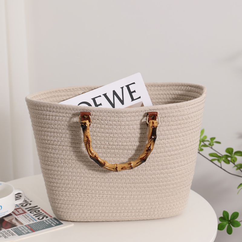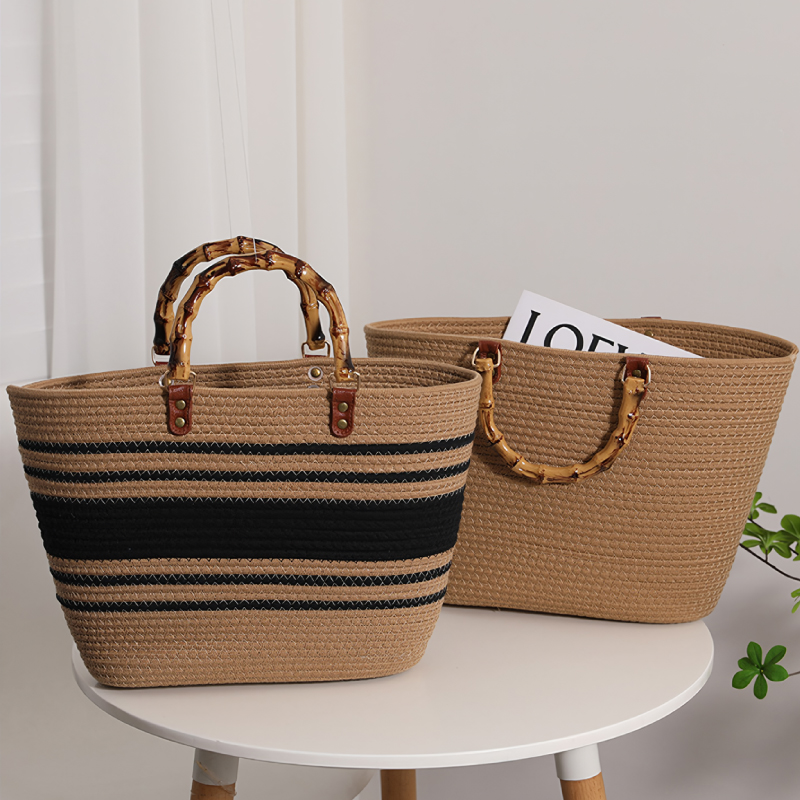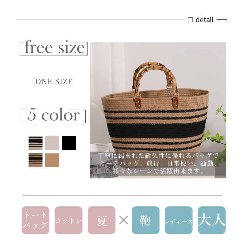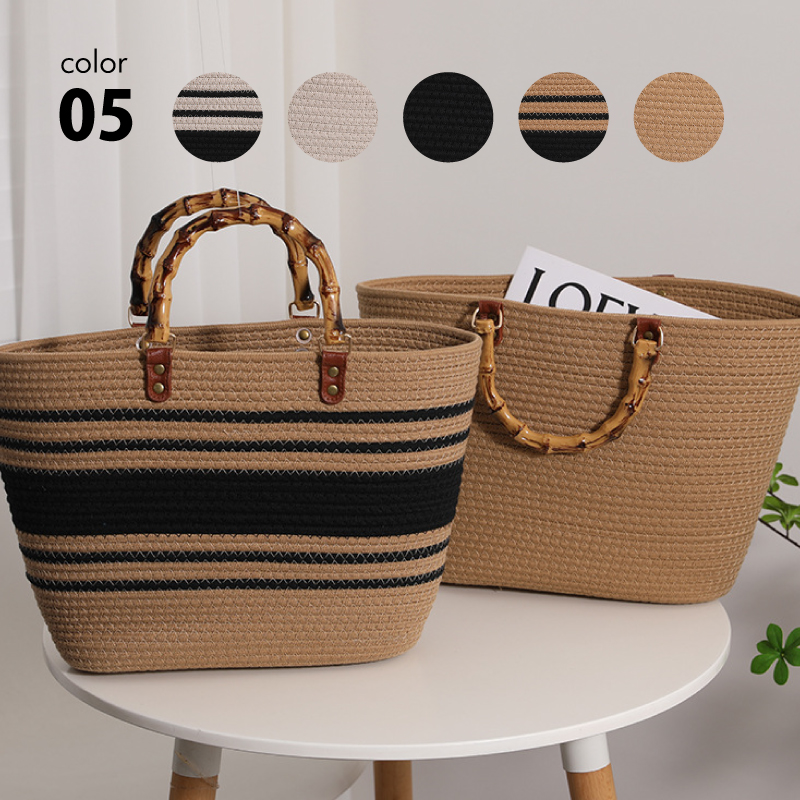 高品質のコットンロープで作られた柔らかい編みバッグ。バンブーハンドルがスタイリッシュで高見え。丁寧に編まれた耐久性に優れるバッグでビーチバッグ、旅行、日常使い、通勤、様々なシーンで活躍出来ます。柔らかな形状で収納など必要に応じて平らに変形させることも可能。たっぷり入るので夏のイベントにも活躍すること間違いなしです。