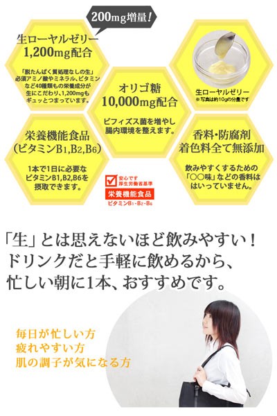 | 体にいいもの、この一本の中に凝縮!! 1本に生ローヤルゼリー1200mg配合!これは約360匹の働き蜂が3日間で作る貴重な量。生でもとても飲みやすくしました。さらにおなかのことを考えてオリゴ糖も10000mg配合、栄養機能食品認定。 健康や美容の維持を心がけている人、毎日忙しい人、たばこを吸う人、甘いものが好きな人、お酒をよく飲む人、育ちざかりのお子さま、受験生、がんばりたい人やがんばる時に。 「生」のローヤルゼリーで、もっと元気に美しく。 すっきりとした飲み口で、おいしくいただけます。 |