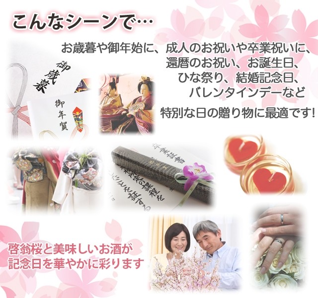 ![]() 桜の開花状況で12月下旬〜3月下旬まで随時、発送となります。 ![]() 啓翁桜と美味しい地酒で華やかに… ![]() | ||||||