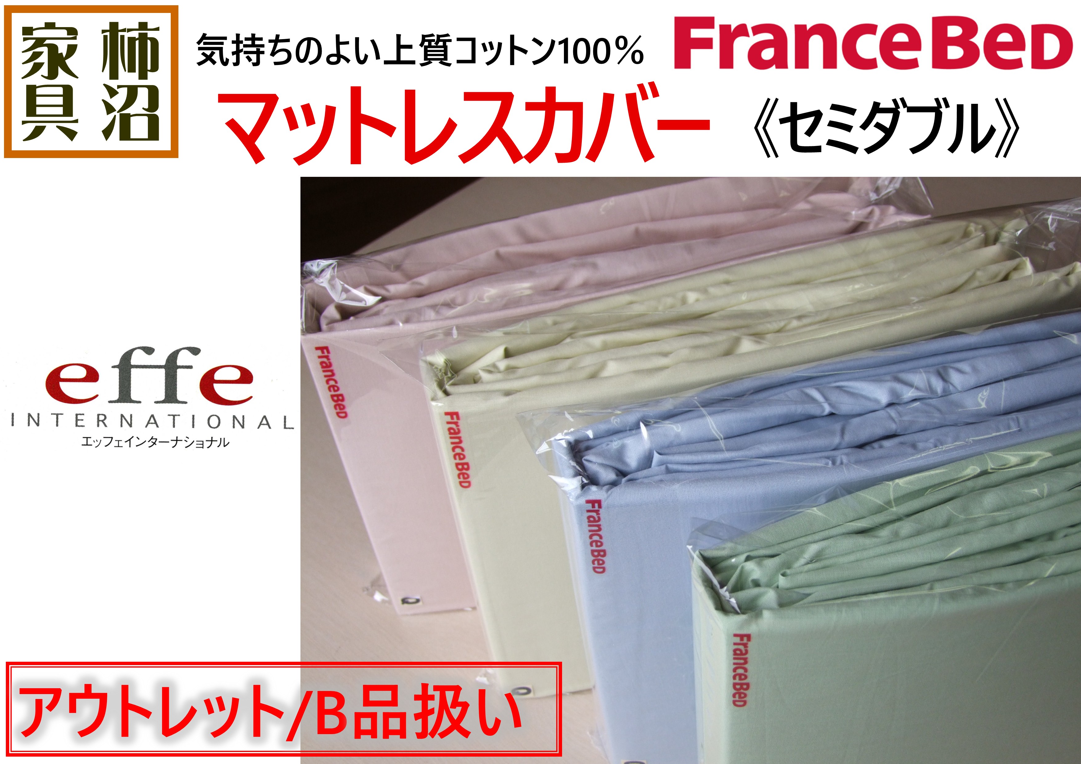 B品特価 ボックスシーツ (マットレスカバー) セミダブル フランスベッド エッフェインターナショナル 綿100% 122×195×35cm