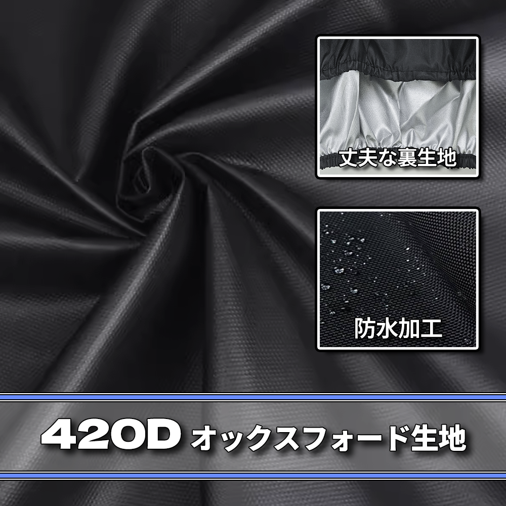 【耐久性に優れた420D生地を採用】耐摩耗性の高い420Dオックスフォード生地を採用、ビニール素材を使用した一般的なカバーよりも厚く頑丈です。表面に防水加工も施されているので、急な雨でもカバー内に雨が浸み込みにくいです。