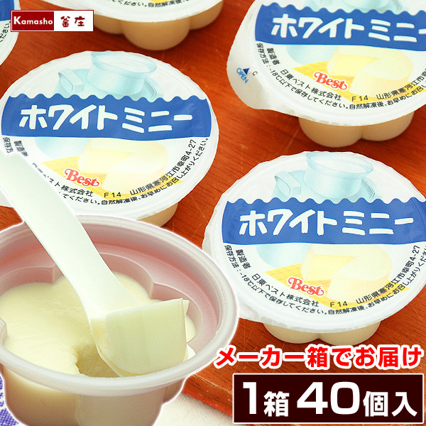 食品表示 | ●ホワイトミニー40ヶ(メーカー箱入) 【原材料名】ホイップクリーム、牛乳、クリームチーズ、ヨーグルト、加糖練乳、水あめ、レモン果汁、脱脂粉乳、ミルクカルシウム、砂糖・ぶどう糖果糖液糖、ゼラチン、寒天/香料、酸味料、(一部に乳成分・大豆・ゼラチンを含む) 【内容量】1ヶあたり30g 【保存方法】要冷凍(−18℃以下) 【販売者】(株)釜庄 福島県いわき市小名浜字吹松2-10 | 備考 | ![]() ※包装形態変更に伴い価格変更しました(2022/10/31) |