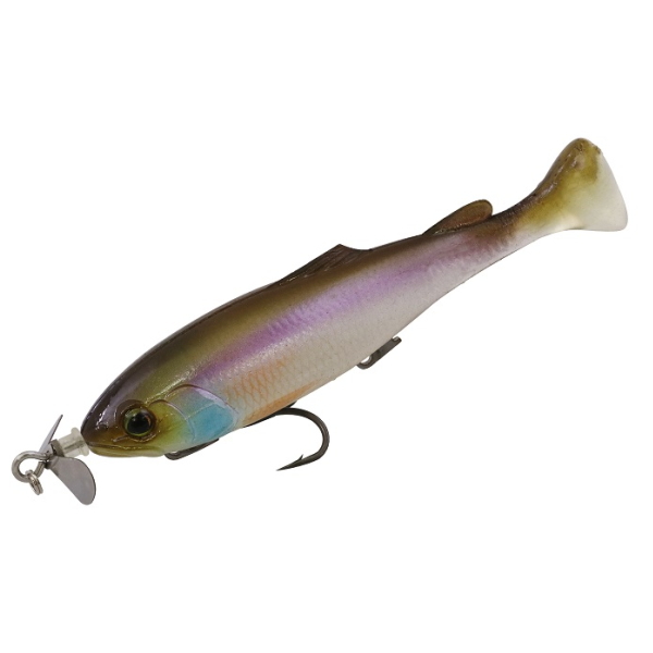 ディズラの要は、ノーズプロップとリッジテール。ノーズプロップは目に見えない強い水流を身にまとい、金属素材のフラッシング効果と回転時の「チリチリ」音を伴って、遠くからバスを呼ぶ効果を持たせています。一方、水流を受け流すリッジテールが、ベイトフィッシュライクでナチュラルな泳ぎを演出し、プロップで寄せたバスを高確率でバイトまで至らせます。