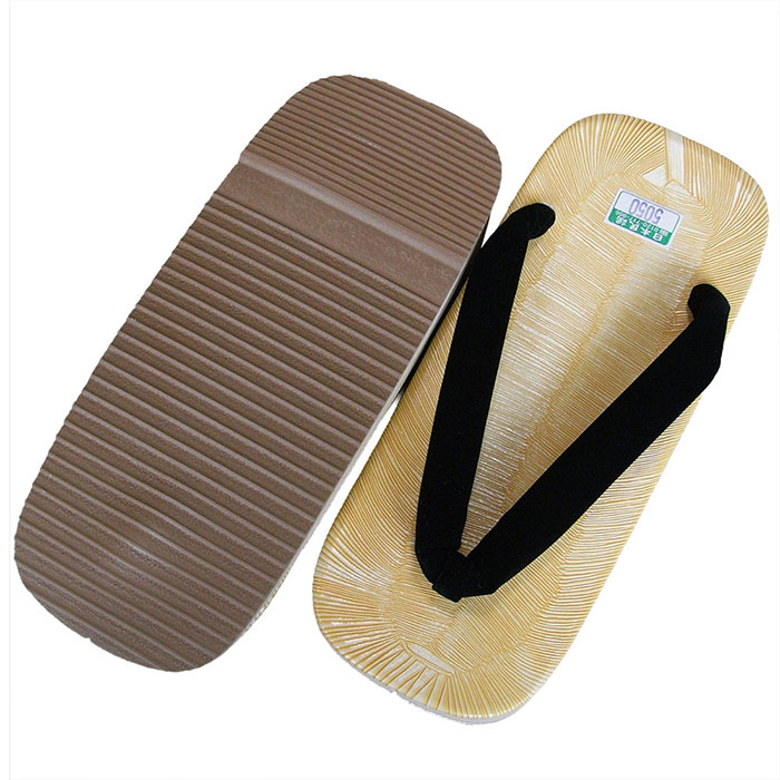 台は、ノザキ表(竹を薄く裂いて編んだ伝統的な草履・雪駄表)をイメージした薄茶&茶の変り縞模様のザラッとした感触のビニールです。鼻緒は足指に優しい黒の別珍(べっちん)=綿ビロード製です。
