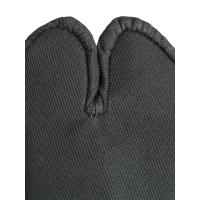 甲表地が黒、底も黒の黒底黒木綿足袋です。生地は甲表地が厚手の綾織生地(葛城「かつらぎ」)、甲裏地は晒、底地表は雲才織「うんさいおり」生地を使用しています。4枚小鉤。