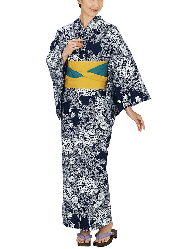 紺地にあじさい・きく・はぎ・ききょうが咲き乱れる長板染ゆかた反物です。約7メートルの長板に綿布を貼り連ね、型紙を使用して防染糊を引いた後、熟練の職人が1反1反染め上げた日本の伝統染織工芸による高級浴衣着尺(生地)です。※画像はすべてお仕立て上がりのイメージです。