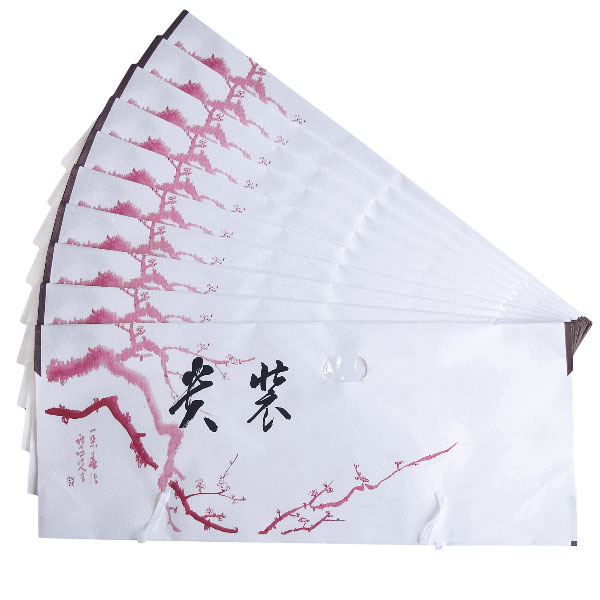 和服収納保管用の畳紙10枚セットです。のぞき窓と「着物のしまい方」の説明書きが付いています。表には墨絵調の梅の柄と「貴装」(=和服を高貴に美しく装うこと?)の文字が入っています。※デザイン変更のため、表の色柄は変わる場合があります。