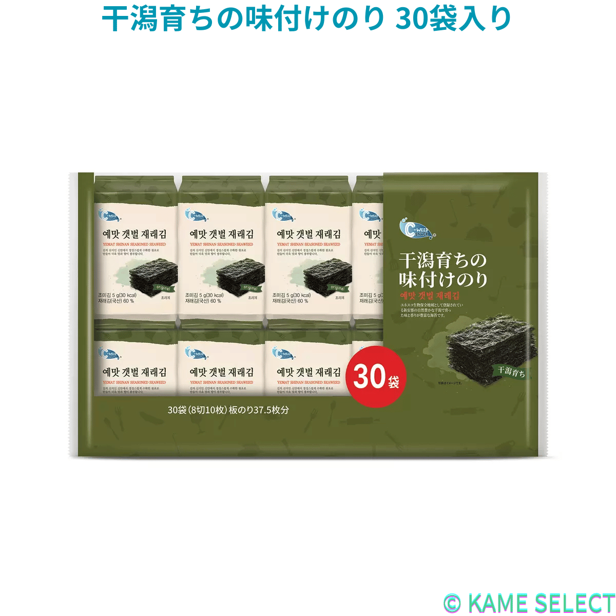 8切10枚 x 30袋 (板のり37.5枚)。香ばしいごまの香りの韓国伝統味付け海苔です。冬獲りの良質な海苔原料を使用。小容量、一袋当たり標準1人1食分。