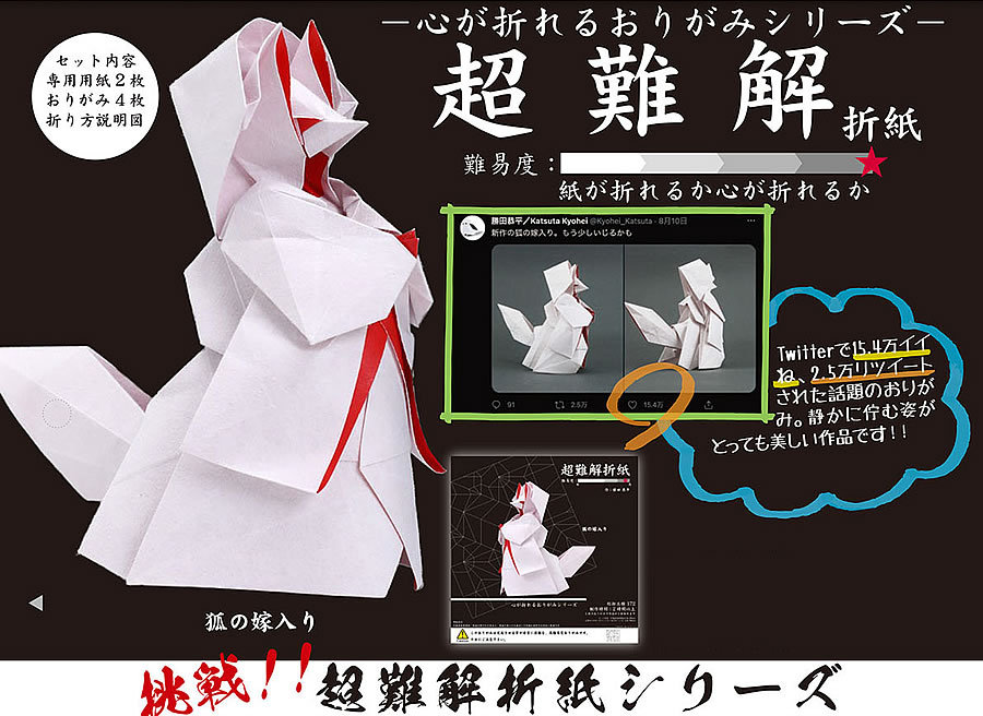 超難解折紙(狐の嫁入り) 心が折れるおりがみシリーズ (TY-006080) 心が折れるおりがみシリーズ 紙が折れるか心が折れるか トーヨー史上最高難度!!使用するのはたった1枚のおりがみ 注意書き:この折り紙は、完成させることが非常に困難な、高難易度おりがみです。十分にご注意ください Twitterで15.4万イイね。2.5万RTされた話題の折り紙。静かに佇む姿がとても美しい作品です 作者:勝田恭平氏 総折工程172 制作時間:2時間以上 片面赤染奉書紙:表面の鮮やかな赤色と、裏面の柔らかな風合いで裏表両面を使用する作品に最適です。 セット内容:片面赤染奉書紙2枚、上質おりがみ(茶・黒・ねずみ・白)4枚、折り方説明図 30.0×30.0×0.2cm *絵柄はサンプル画像です。実際の絵柄と多少異なる場合がございます
