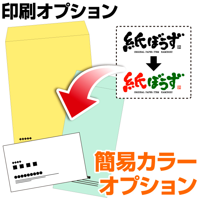 - 封筒の色がブルー・グリーン・オレンジ・イエロー等はインキの色が、かなり違って見えますのでこれらの封筒の色は黒刷りをおすすめします。