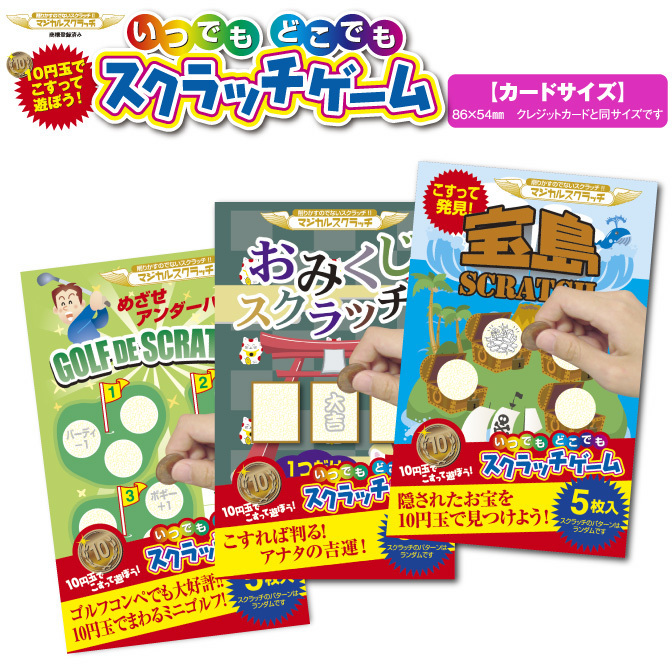 いつでもどこでもスクラッチゲーム「スクラッチゲーム」とは、削りかすの出ない特殊なスクラッチ印刷技術を使用した10円玉でこすって遊ぶ、