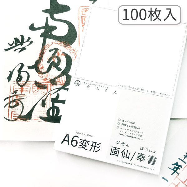 | 書き置き向けのサイズの和紙が100枚入ったセットです。奉書紙を一般的なサイズの御朱印帳(約11×16cm)にぴったり貼れる大きさにカットいたしました。こちらの奉書紙以外にも、白大礼紙、五色鳥の子紙の合計三種類の和紙をご用意いたしました。 『奉書紙』は三種類の中で少し厚みがあり、しっかりとした和紙。真っ白で使いやすく、和紙特有の温かみも併せ持った紙となっております。また、裏面は”画仙”と呼ばれる紙質となっており、こちらの面をご使用いただくことも可能です。画仙は表面にざらつきがあるのが特徴で、柔らかい雰囲気に仕上がります。 『白大礼紙』は角度によってきらりと光る雲龍が美しい和紙。柔らかい手触りと華やかな見た目が、お礼状や招待状などにぴったりです。 『五色鳥の子』は桃・紫・黄・草・水の5色が20枚ずつ入ったセットです。どの色も鮮やかでありながらもきつい印象はなく、使いやすい用紙となっております。 もっとお買い得な1000枚セットもございます。紙質違い、および枚数違い、いずれも下の関連商品ページよりご購入いただけます。 書き置き用としてはもちろん、お手紙や小さなチラシ、メニュー表などご自由にお使いいただける和紙となっております。さまざまなシーンに合わせてぜひご活用ください。 「かみもん」は京都で70年以上にわたり、色紙・御朱印帖・その他の和本類、また様々な和紙加工品の製造を続けてきたメーカーです。一枚一枚、また一冊一冊、丁寧に作っております。京の地から、手仕事をお届けいたします。 |