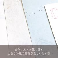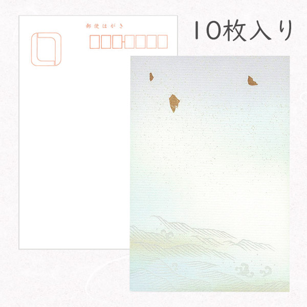 淡い青が全体にボカシで入っており、上部には切箔、下部には寄せる波がデザインされた一枚。上品でやわらかく美しいデザインですので、毛筆にもよく合うハガキとなっております。