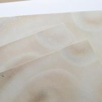 星雲ボカシを施した、珍しい柄のかな料紙です。 上品な淡い茶色を背景に大胆にボカシを入れ、金銀の切箔や砂子で美しく仕上げました。 和紙は楮紙を使用し、薄く具引きをしております。 表面にはにじみにくい加工を施しております。