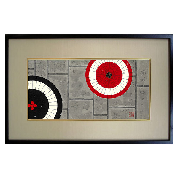 加藤晃秀(大)先生(1936年〜2015年)。京都市生まれ京都美術大学日本画科卒業後、デザイン工房を設立し、各種工芸品企画に参画する一方、独特のタッチの“粋画”を創案されました。ニューヨークなどの各地で個展を開催し、海外からも注目を集めています。白と黒を基調にした大胆な構図で古都の風情を描き、木版画で再現いたしました。画面下に落款入り。