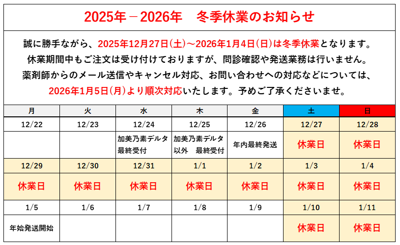 ※金曜日や連休前のご注文は休業日(土日祝)を挟むため、薬剤師からの連絡および発送手配に5日程度かかります。予めご了承ください。