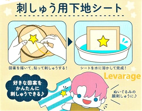 この刺繍用下地シートは、簡単に好きな図案を刺繍するための便利なアイテムです。以下の手順で使用します: 図案を描いて貼る: 刺繍したい図案をシートに描き、それを布に貼ります。このシートは、描いた図案をそのまま刺繍するためのガイドとして役立ちます。 刺繍を行う: シートの上から刺繍を行います。図案に沿って刺繍をすることで、正確で綺麗な刺繍が完成します。 シートを溶かして完成: 刺繍が終わったら、シートを水に溶かします。シートは水に溶ける素材でできているため、刺繍部分だけが残り、シートはきれいに消えます。 このシートを使うことで、ぬいぐるみの顔刺繍や服のデザインなど、様々なアイテムに簡単に刺繍を施すことができます。初心者でも手軽にプロフェッショナルな仕上がりを楽しむことができる便利な商品です。
