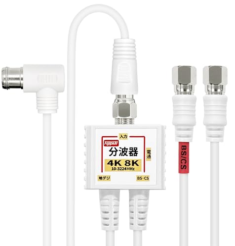 分波器ケーブル長:20cm、入力端子:F型ジャック、出力端子:F型接栓プラグ、付属ケーブル長:1.5m、F型プラグ L型 -F型コネクタ(接栓ネジタイプ)、カラー:ホワイト、プラグ部分:ニッケルメッキ