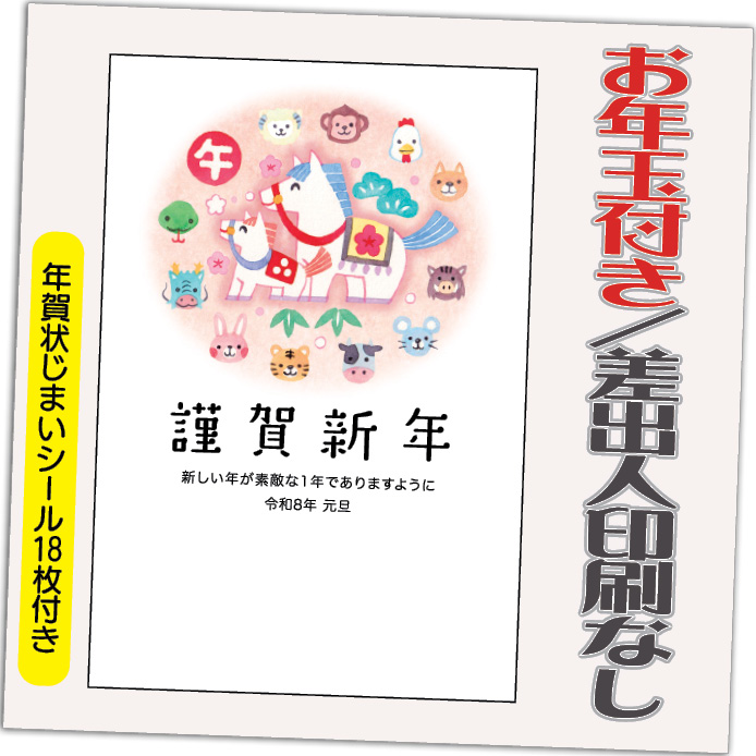 年賀状 年賀はがき 4枚 お年玉付き 年賀状じまいシール付 2026年 差出人なし(デザイン:HA060) うま 馬 午年 かわいい イラスト