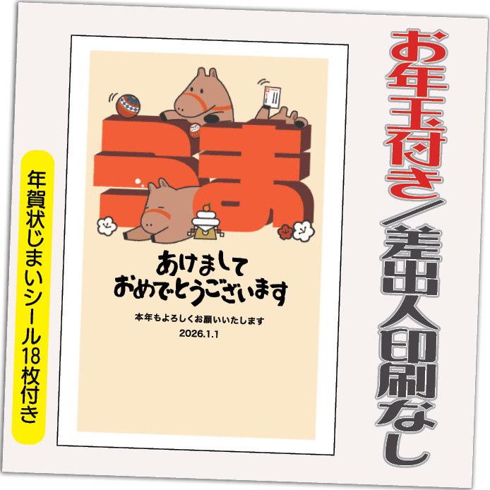 年賀状 年賀はがき 4枚 お年玉付き 年賀状じまいシール付 2026年 差出人なし(デザイン:HA078) うま 馬 午年 かわいい イラスト