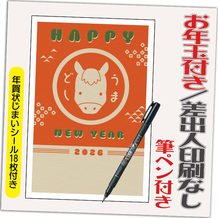 年賀状 年賀はがき 4枚 お年玉付き 年賀状じまいシール付 筆ペン付き 2026年 差出人なし(デザイン:B0437) うま 馬 午年 かわいい イラスト