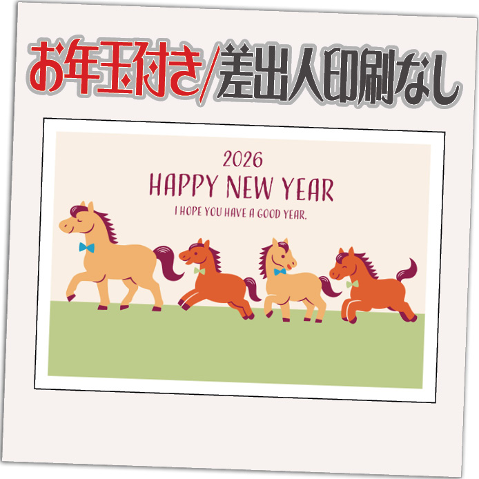 年賀状 年賀はがき 12枚 お年玉付き 年賀状じまいシール付 2026年 差出人なし(デザイン:B0151) うま 馬 午年 かわいい イラスト 10枚+2枚