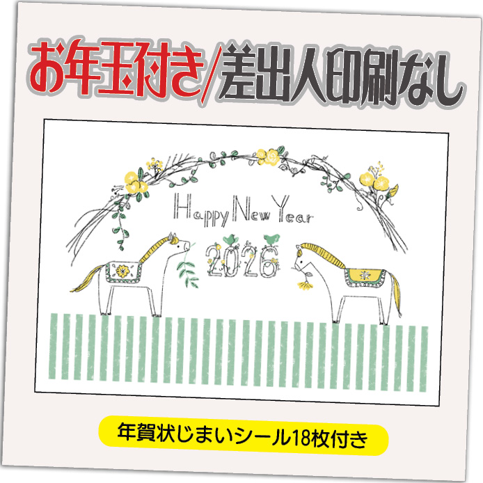 年賀状 年賀はがき 12枚 お年玉付き 年賀状じまいシール付 2026年 差出人なし(デザイン:B0317) うま 馬 午年 かわいい イラスト 10枚+2枚