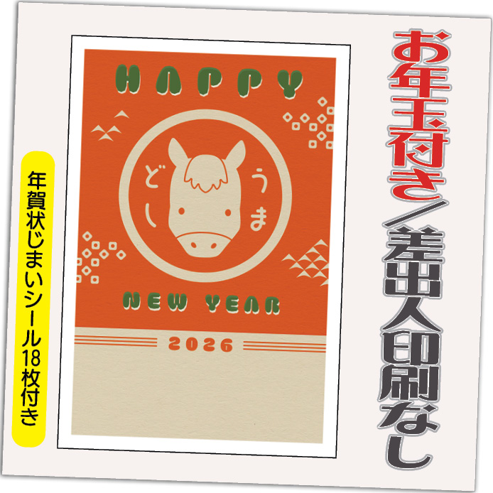 年賀状 年賀はがき 12枚 お年玉付き 年賀状じまいシール付 2026年 差出人なし(デザイン:B0437) うま 馬 午年 かわいい イラスト 10枚+2枚