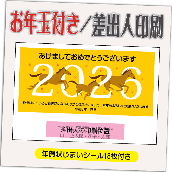 年賀状 年賀はがき 12枚 お年玉付き 年賀状じまいシール付 2026年 差出人印刷込み(デザイン:GA08) うま 馬 午年 かわいい イラスト 10枚+2枚